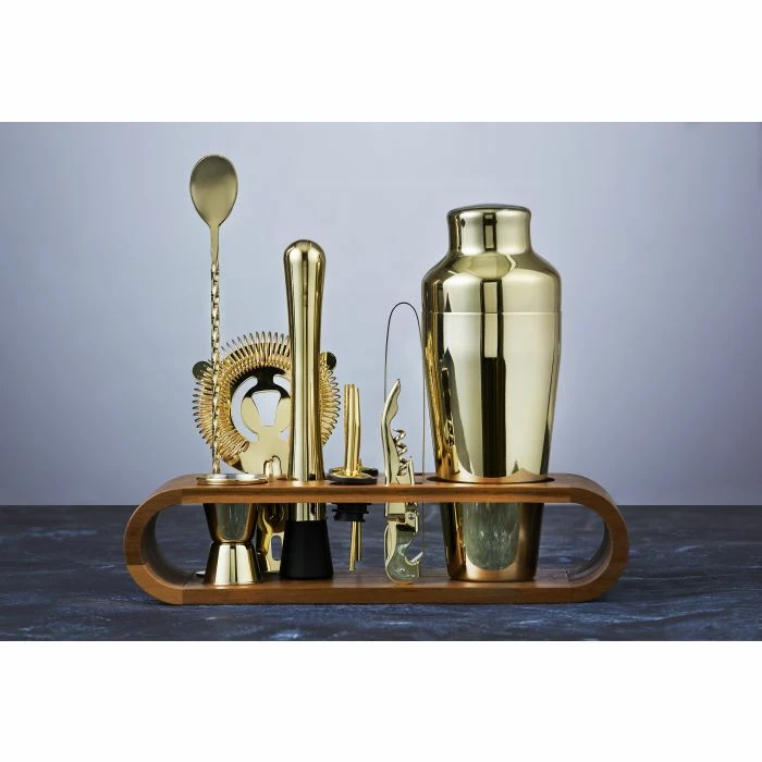DAVIS & WADDELL 10 PIECE BAR SET IN GOLD WITH ACACIA STAND