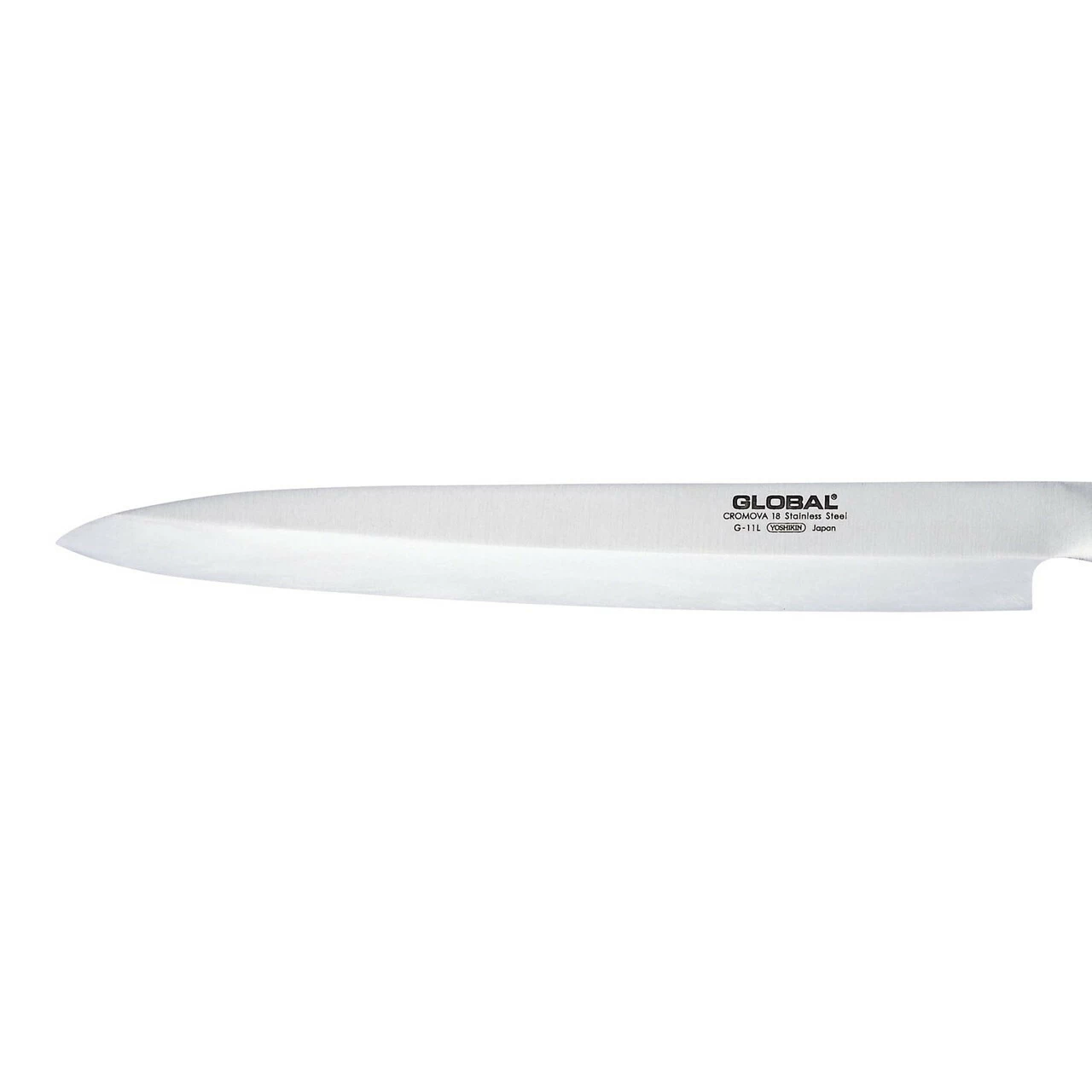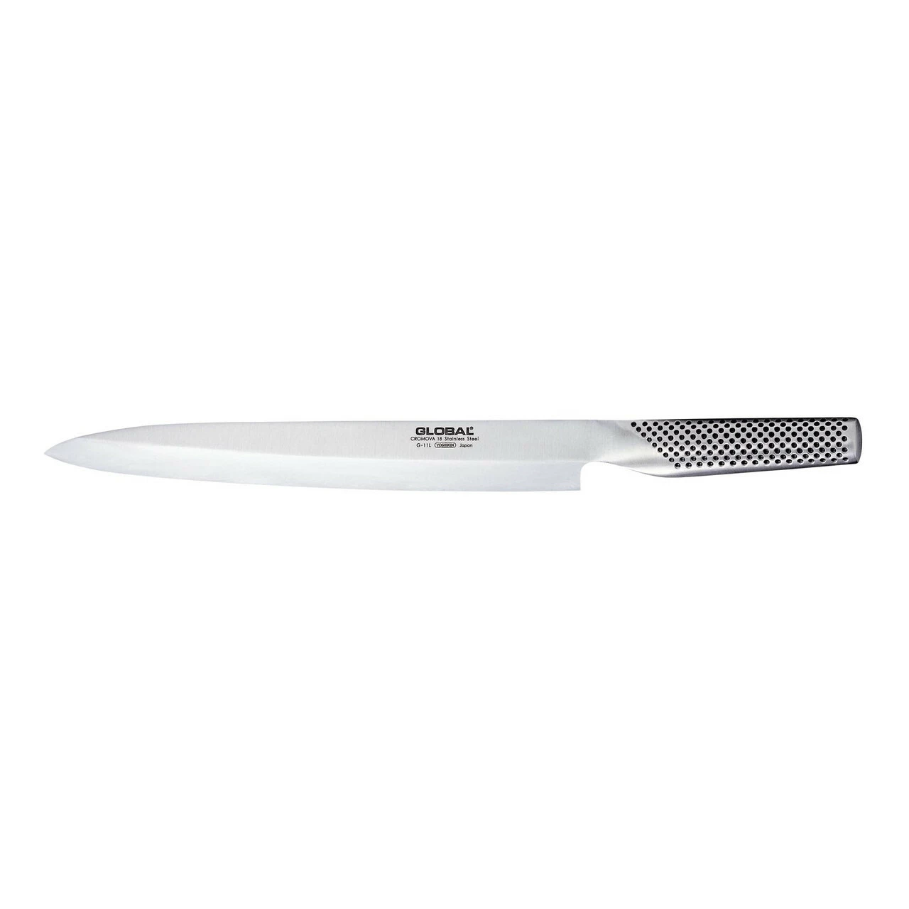 The G-11 is made from CROMOVA 18 stainless steel, specially developed by GLOBAL as it holds a razor-sharp edge and resists rust, stains and corrosion. Ice tempered and hardened to Rockwell C56-58, each knife is carefully weighted by filling the handles with sand to achieve the optimum weight and perfect balance.