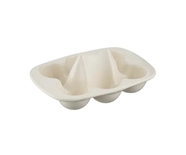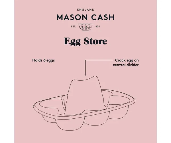 This egg store holds 6 eggs and the central hub is raised to a point so that eggs can be cracked on it rather than on sides of pans.