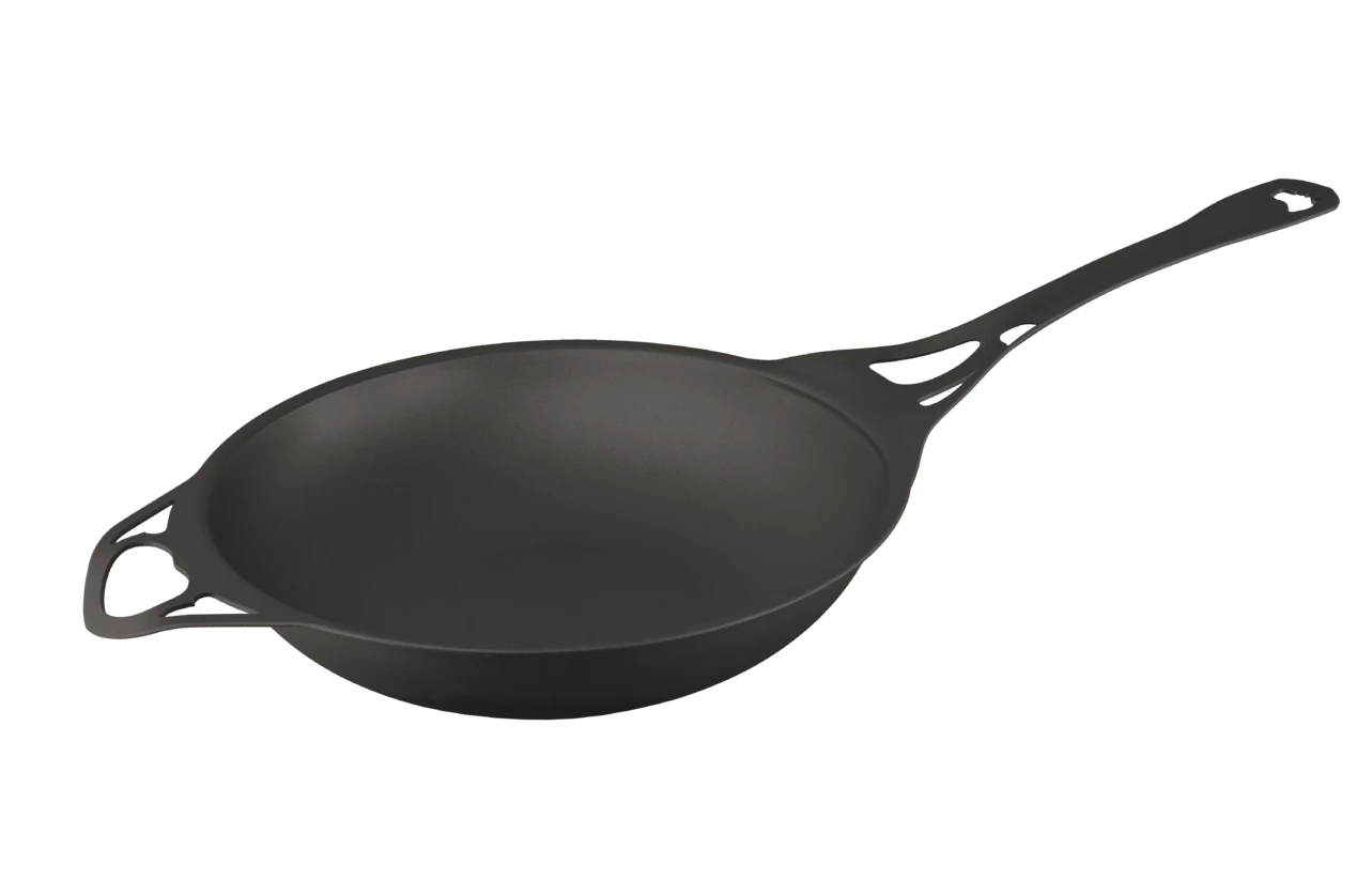 AUS-ION™ 28cm Sauteuse Bombée/Sautuese Wok. 2.5mm thick wrought iron for even/fast heating. ‘Bombed’ deep sauteuse body and long handle for the ideal ‘Lyonnaise’ French sauté, or wok toss. Helper handle for heavy loads.