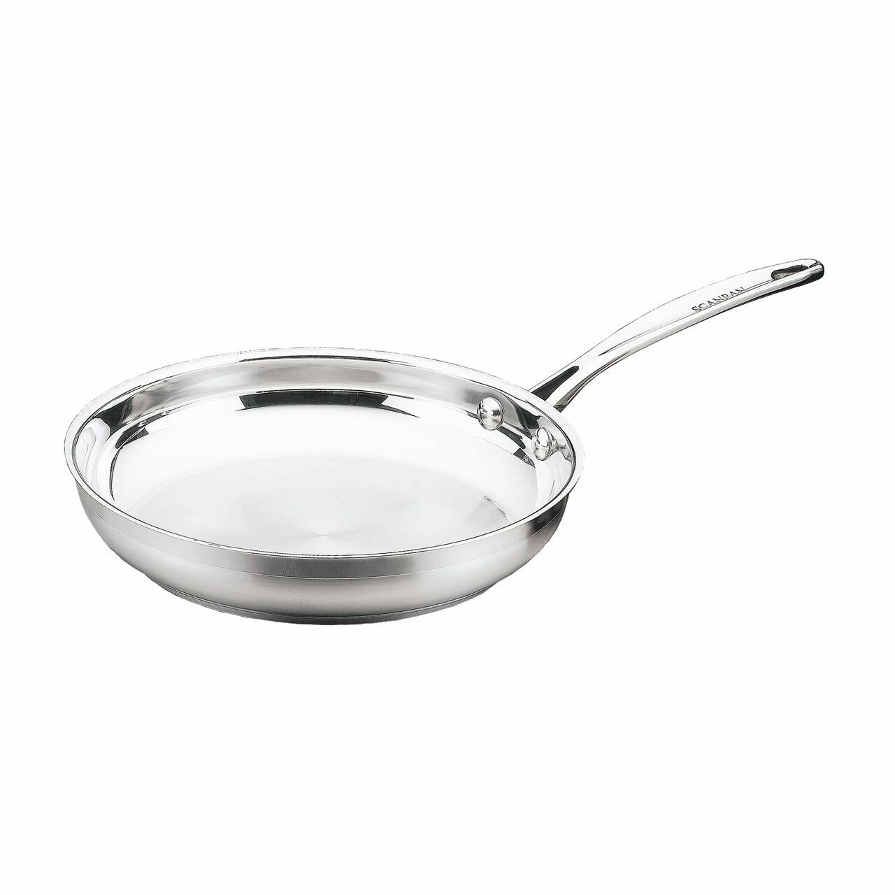 This 28cm Fry Pan has a stylish two tone matt/polished appearance. The optimal 6.4mm thick bonded sandwich base ensures optimal heat distribution. Compatible with all energy sources including induction, this range is as wide as it is popular. The rim design allows for drip-free pouring and the handles are secured with stainless steel rivets.