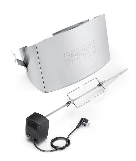 Take your grilling repertoire to a whole new level with a Weber family Q rotisserie. It comes complete with a rotisserie spit with two spit forks that can handle a whole chicken or large roast. This BBQ rotisserie is powered by a heavy duty electric motor to ensure smooth turning for even cooking all the way around.